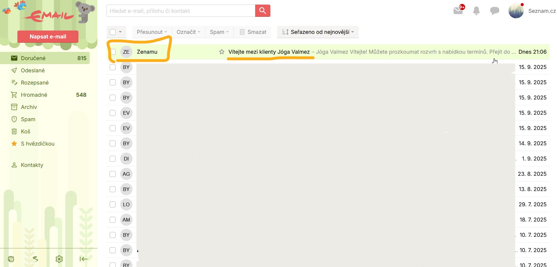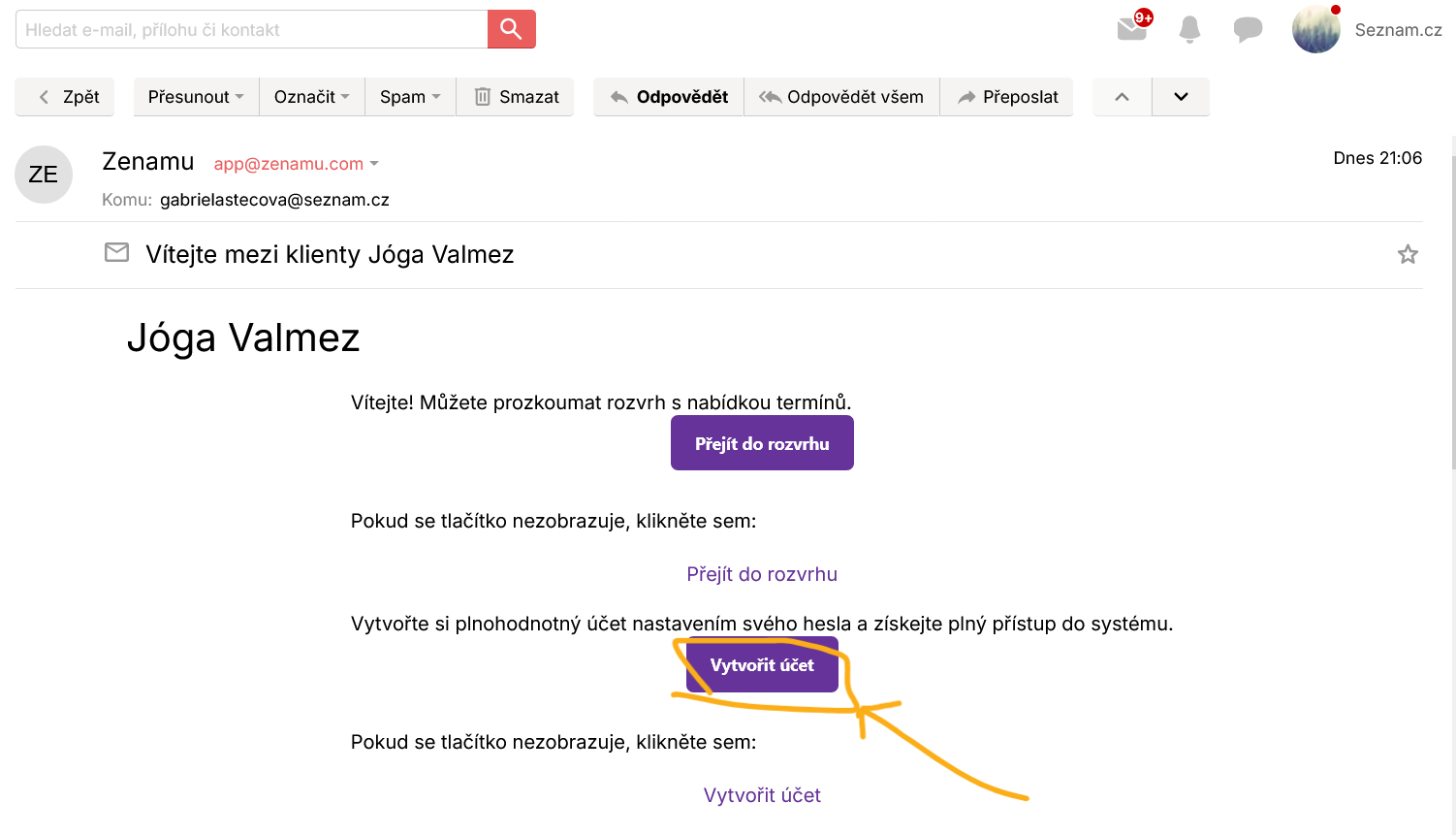 Hned po zaplacení lekce, akce nebo kurzu, vám přijde na e-mail od "Zenamu" s předmětem "Vítejte mezi klienty Jóga Valmez", e-mail otevřete a klikněte na tlačítko "vytvořit účet".