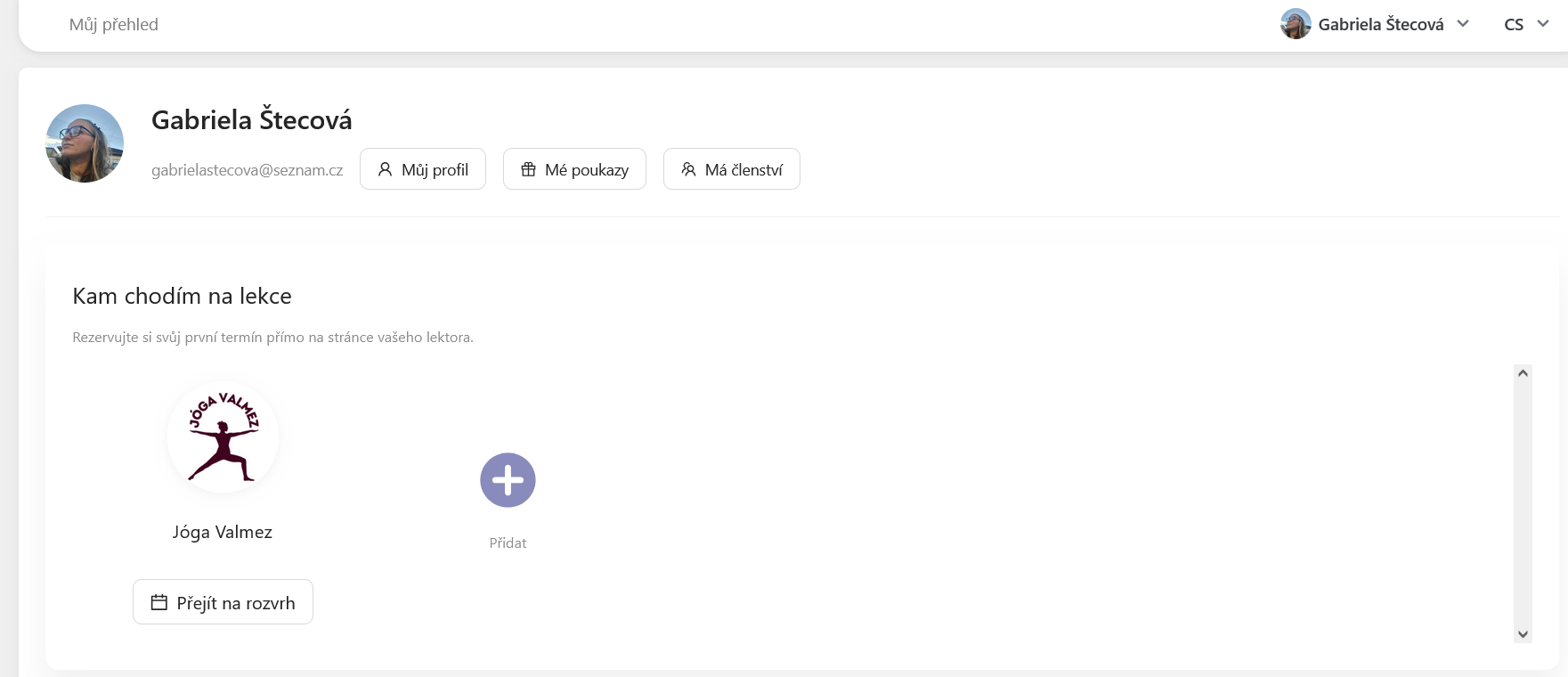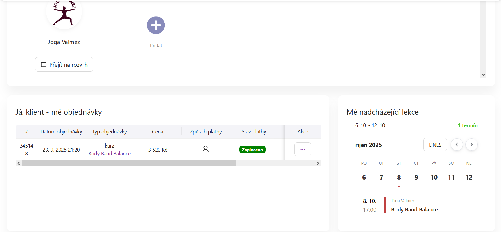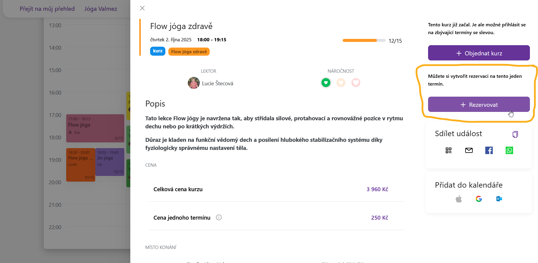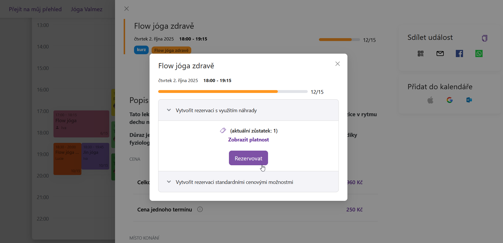 Pokud si chcete lekci nahradit, vyberte si v rozvrhu https://app.zenamu.com/joga-valmez?from=1758664800 nějakou, kde je místo, a klikněte na "Rezervovat".