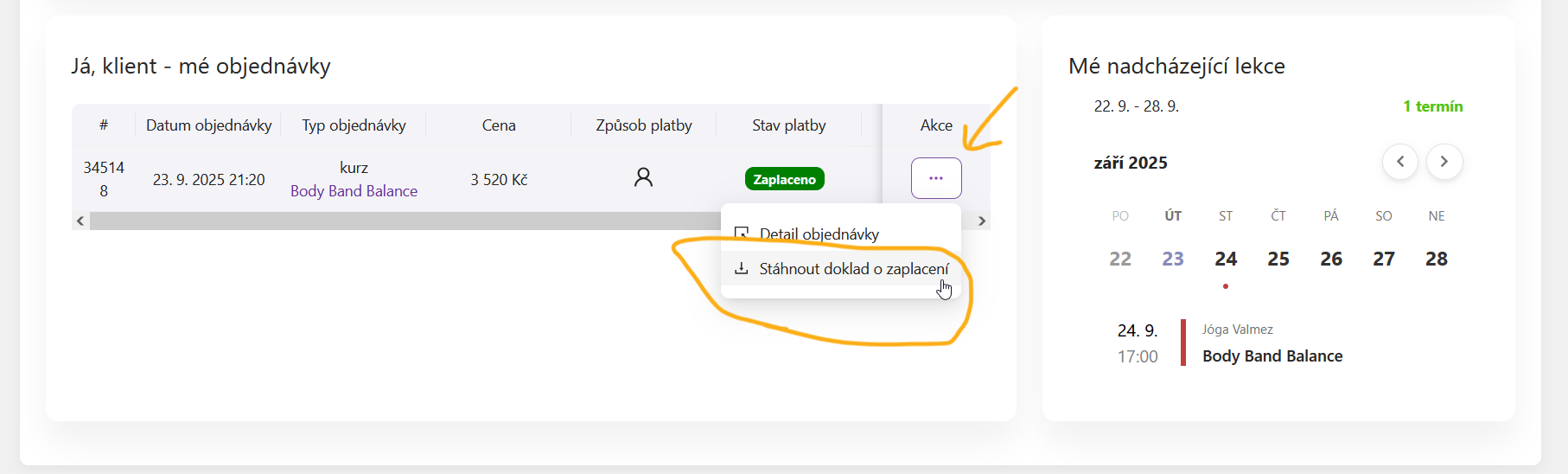 Ve svém účtu na https://app.zenamu.com/app sjeďte na stránce dolů k sekci "Já, klient - mé objednávky". Zde pod "Akce" klikněte na 3 tečky a poté na "Stáhnout doklad o zaplacení".