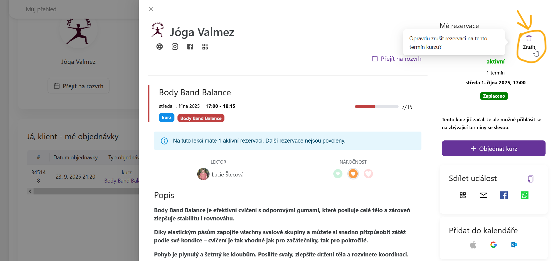 Pokud se na lekci nemůžete dostavit, jednoduše tu konkrétní lekci otevřete v rozvrhu buď v nadcházejících lekcích nebo na tomto odkazu: https://app.zenamu.com/joga-valmez?from=1758664800