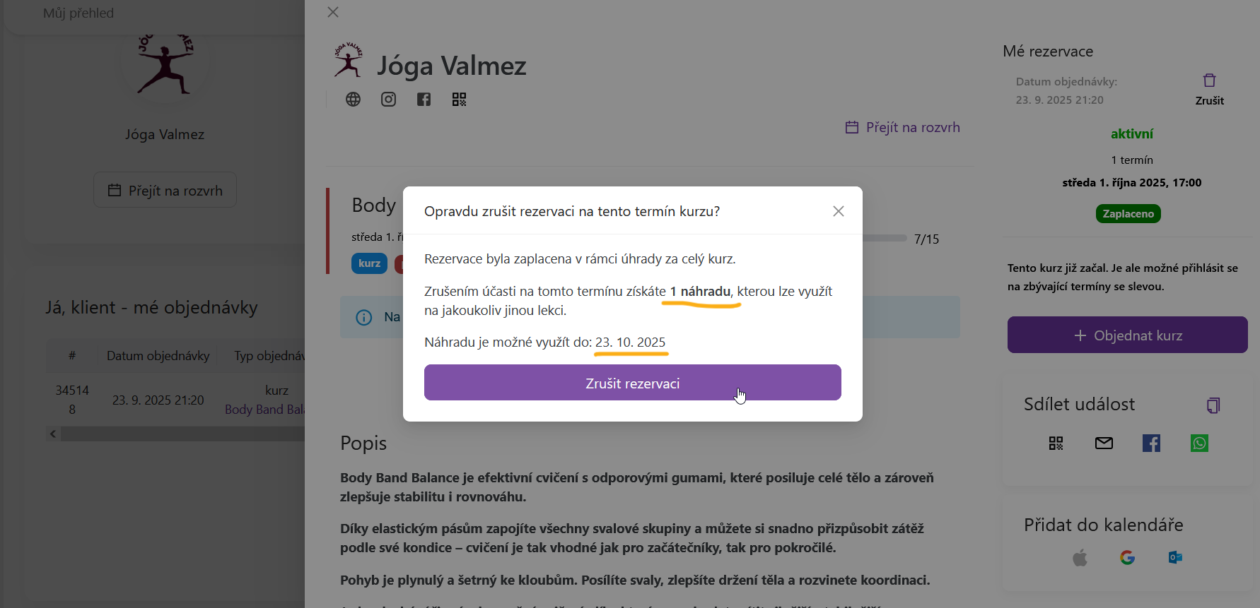 Lekci můžete zrušit nejpozději 12 hodin před jejím začátkem, abyste měli nárok na náhradu (Náhradu je možné využít 60 dní od jejího získání).